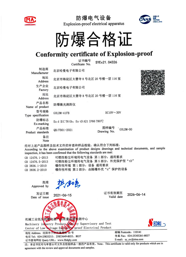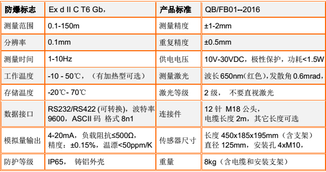 GOLDM-41FB 型隔爆激光机器测距仪首先需要好使用在发生爆管道煤气味具体情况中 1 区或 2 区 IIC 类 T6 组及以內 的发生爆燃高风险在日常生活中,使用在钢铁设备厂、管道煤气厂、煤焦厂、航空煤油所有等易爆在日常生活中物位、料位及液位的精确测量。